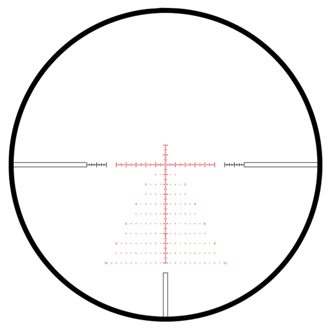 The FFP Mil Pro (20x) reticle was developed specifically for first focal plane optical systems and based around the common principles of Mil spaced reticles. With half Mil spaced markings extending out to 10 Mil of holdover, the FFP Mil Pro is a versatile reticle that provides aim points no matter how extreme the distance. The FFP Mil Pro 20x has additional 1/4 Mil aim points on the center section of the reticle to give even greater precision.